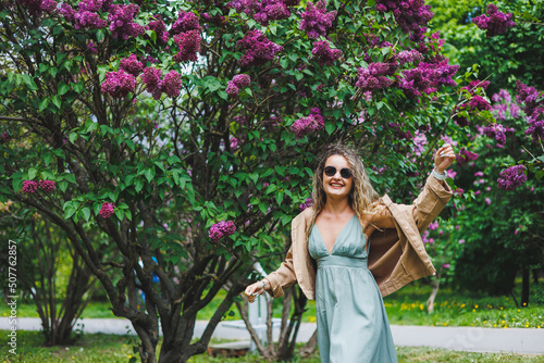 © DSMT, Naklejka premium A beautiful curly woman in a summer dress runs and rejoices, she is wearing sunglasses. Against the background of a purple lilac bush
