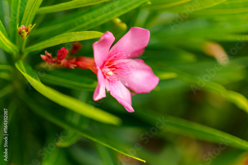 Fototapeta premium A Beautiful, Delicate Pink Blooming Oleander Flower is Nestled Amidst Lush...