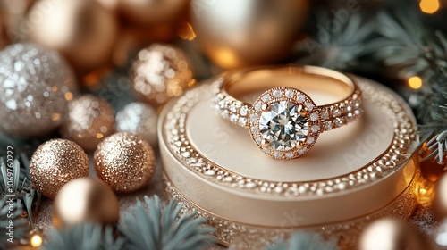 © siyons, Fototapeta premium A beautiful diamond ring in a box, surrounded by Christmas ornaments and pine branches.