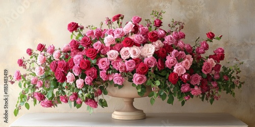 © meristock, Obraz premium A beautiful display of pink roses and red roses elegantly arranged on a table, showcasing the vibrant colors and delicate beauty of roses in a charming setting.