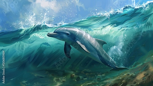 © isend, Obraz premium A beautiful dolphin swims gracefully through foamy blue ocean waters