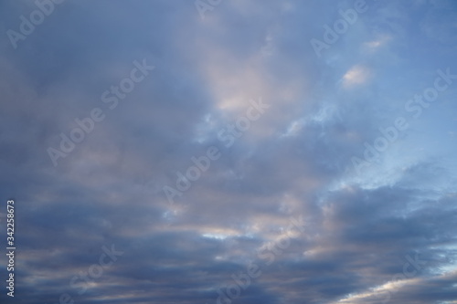 Obraz premium A beautiful evening blue sky at sunset with flaming bright light clouds. Warm...