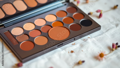 Naklejka premium A beautiful eyeshadow palette featuring warm neutral tones lies on a soft...