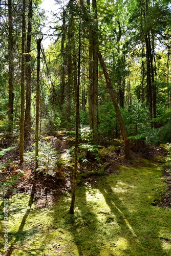 Obraz premium A beautiful fall landscape in woods with green trees and moss in Quebec, Canada
