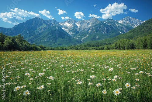 © Fotograf, Fototapeta premium A beautiful field of colorful wildflowers against a majestic mountain backdrop