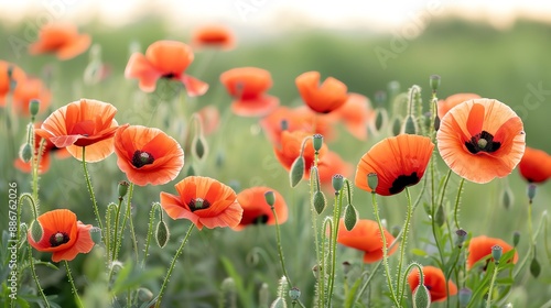 © Vangly, Obraz premium A beautiful field of red poppies at dusk