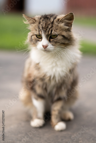 Fototapeta premium a beautiful fluffy cat washes itself in the yard