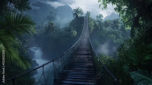 © Natchooda, Obraz premium A beautiful, fog-covered suspension bridge stretches through a lush tropical forest, surrounded by mist and towering trees, inviting exploration