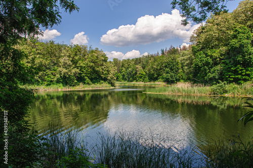 Fototapeta premium A beautiful forest lake surrounded by blooming acacia and reeds. Ukraine