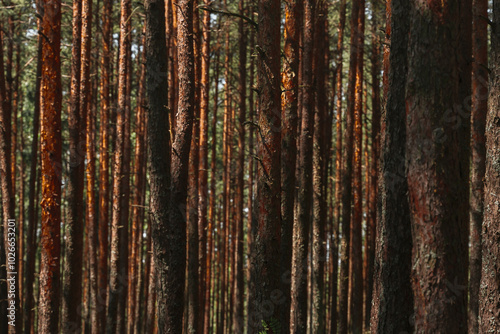 Obraz premium A beautiful forest with pine trees, smooth tree trunks in rows.