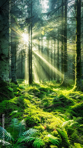 Fototapeta premium A beautiful forest with sunlight shining through the trees