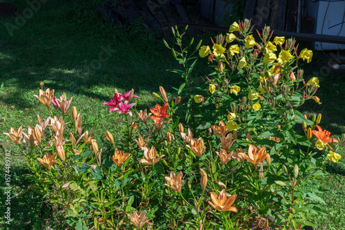 © snezhkina, Obraz premium A beautiful garden displaying colorful lilies and vibrant yellow flowers.