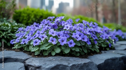 © Linus, Fototapeta premium A beautiful garden of purple flowers is growing on a rock