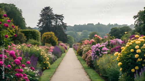 Fototapeta premium A Beautiful Garden Scene Showcasing a Pathway Bordered by Lush, Colorful Flowers