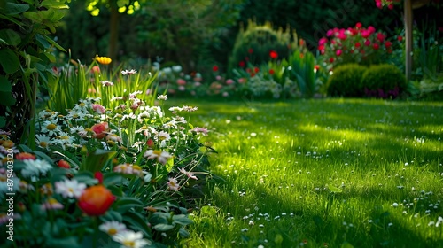 Obraz premium A beautiful garden with a green lawn picture