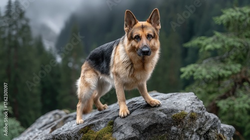 Naklejka premium A beautiful german shepherd is perched on a rock, surveying its surroundings...