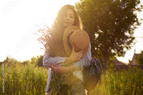 © maxbelchenko, Fototapeta premium A beautiful girl with a bouquet of lavender. She is dressed in a blue shirt, a white T-shirt. A good summer sunny evening. The girl is smiling. Sunny sunset light