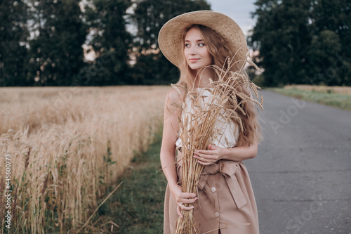 © Евгений Александров, Obraz premium a beautiful girl with long brown hair in a field with ears of wheat