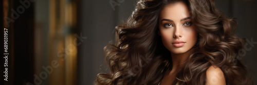 Fototapeta premium A beautiful girl with neutral makeup and gorgeous voluminous curly hair. Design template with an empty space for your text.