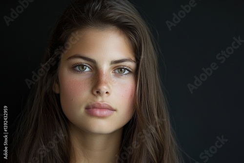 Fototapeta premium A beautiful girl with straight long brown hair, adorned with a stunning...