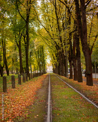 Naklejka premium A beautiful golden autumn scenery of a leaf covered pathway in Riga, Latvia. Sunny day in a city.