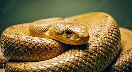 © Slamat, Fototapeta premium A beautiful golden snake coiled, its scales glistening exquisitely under soft light, portraying an intriguing and elegant wildlife moment.