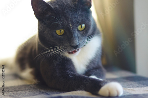 Naklejka premium A beautiful gray cat with yellow eyes made a strange face, playing with a...