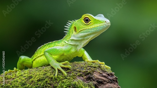 Fototapeta premium A beautiful green lizard perched on a mossy log
