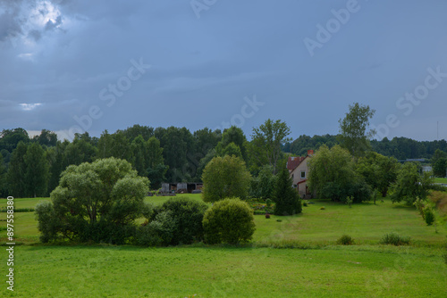 © Aivis, Fototapeta premium a beautiful green meadow with dark gray dedes before the rain