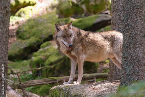 Fototapeta premium A beautiful grey wolf in the forest. Canis lupus. Wildlige scene with a...