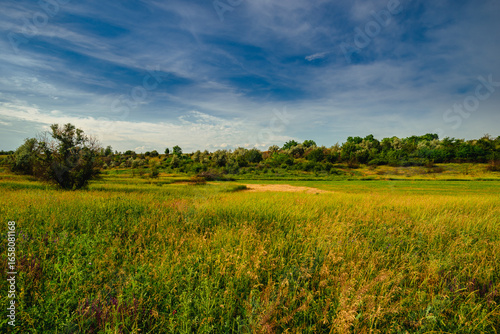 © Aleksandr Riabinin, Fototapeta premium A beautiful horizontal landscape of a wild field in the Ukrainian countryside, with a mix of green and golden grasses under a brilliant blue sky with wispy clouds.