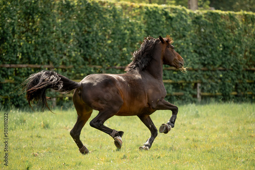 Fototapeta premium A beautiful horse gallops through a green meadow