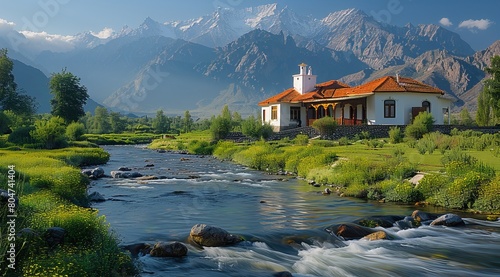 Naklejka premium A beautiful house in the middle of kashmiri village with green grass and river flowing, a red roofed white building on right side, dark mountains