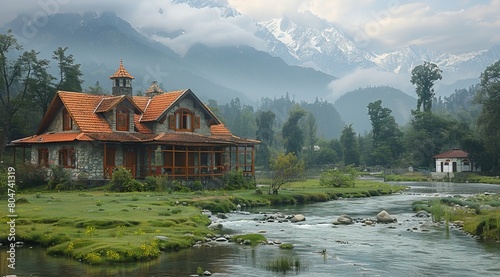 © Gomi555, Fototapeta premium A beautiful house in the middle of kashmiri village with green grass and river flowing, a red roofed white building on right side, dark mountains behind