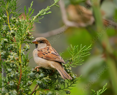 Fototapeta premium A beautiful house sparrow(Passer domesticus)perched on a tree branch,with...
