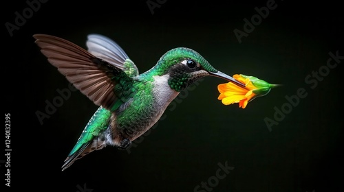 Fototapeta premium A beautiful hummingbird hovering gracefully while sipping nectar from a vibrant orange flower in a serene environment