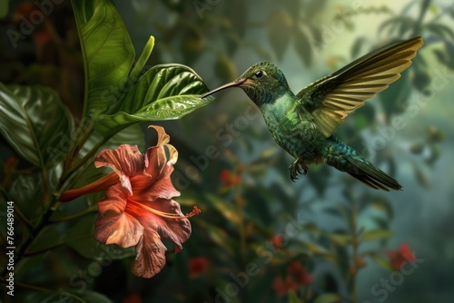 © Fotograf, Obraz premium A beautiful hummingbird in flight over a colorful flower. Perfect for nature and wildlife concepts