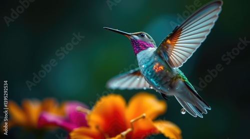 Fototapeta premium A beautiful hummingbird in flight with open wings and iridescent feathers