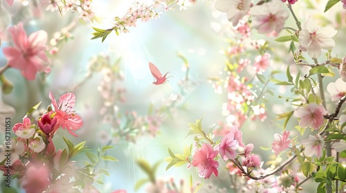 © lililia, Fototapeta premium A beautiful image featuring a delicate pink bird in flight against a backdrop of pink cherry blossoms in full bloom