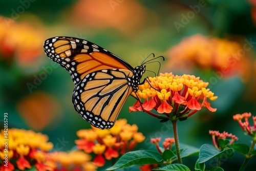 Fototapeta premium A beautiful image in nature of a monarch butterfly on a lantana flower, summer