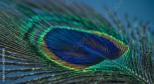 Obraz premium A beautiful, iridescent macro peacock feather close-up reveals its intricate blue and green pattern