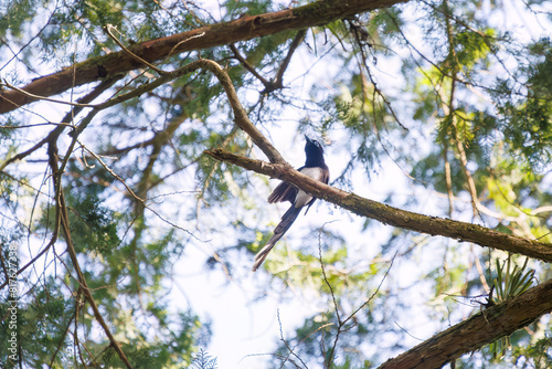 © d3_plus, Fototapeta premium 新緑の林の奥で美しくさえずる、長い尻尾の美しいサンコウチョウ(カササギヒタキ科)。 日本国東京都八王子市、八王子城跡にて。 2024年5月撮影。 A beautiful Japanese Paradise Flycatcher (Terpsiphone atrocaudata) with a long tail chirps beautifully in the depths of a fresh