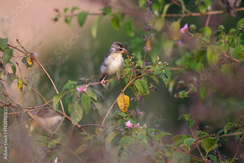 © siva, Fototapeta premium A beautiful juvenile baya weaver perched on a slender branch with lot of leaves and searching feeds with blurred background.