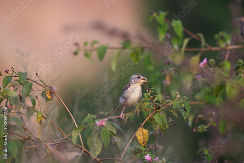 © siva, Fototapeta premium A beautiful juvenile baya weaver perched on a slender branch with lot of leaves and searching feeds with blurred background.