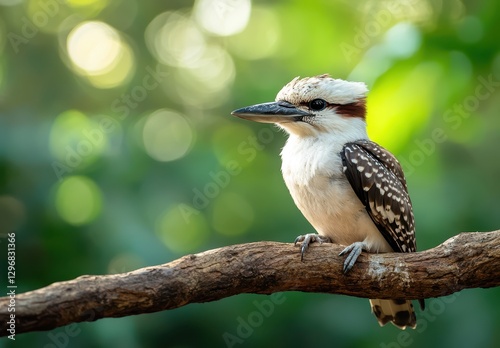 © Mardhiah, Fototapeta premium A beautiful kookaburra perched on a branch with vibrant blurred green background, showcasing its unique features and majestic plumage in nature.
