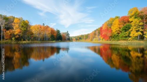 © OZTOCOOL, Fototapeta premium A beautiful lake with a blue sky and trees in the background