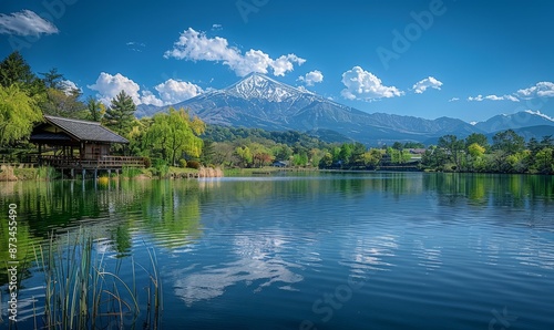 © Valentyna, Fototapeta premium A beautiful lake with a mountain in the background
