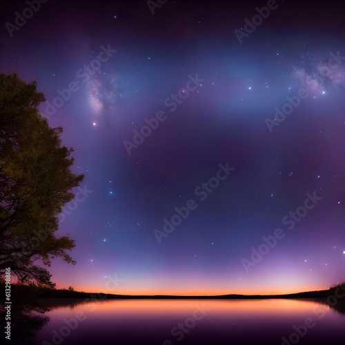 Naklejka premium A beautiful lake with trees under a starry sky with neon colors. Generative AI