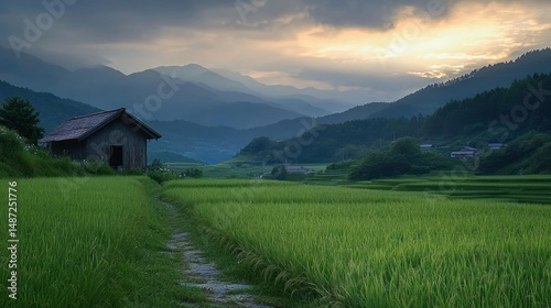 © ida, Fototapeta premium A beautiful landscape features fields mountains and a small wooden structure