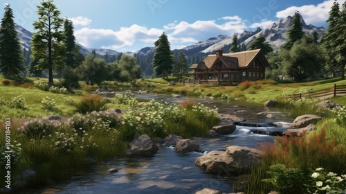 Obraz premium A beautiful landscape image of a cabin in the mountains.